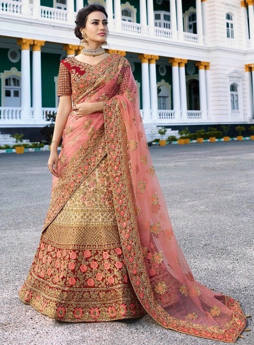Light Cream Red Bridal Indian Lehenga Choli Online